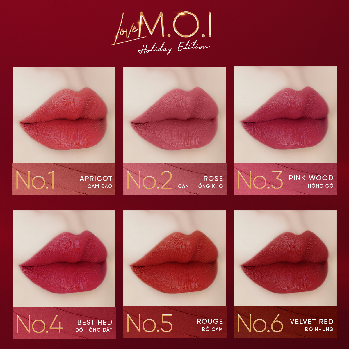 Bộ sưu tập son thỏi Love M.O.I Holiday Edition mang đến sáu lựa chọn màu sắc đa dạng từ tông cam đào trẻ trung đến các sắc đỏ nhung sang trọng dành cho mùa lễ hội. Sản phẩm nổi bật với công thức chứa các thành phần dưỡng chất như Squalane, sáp ong và sáp Candelilla giúp đôi môi luôn mềm mại và được cấp ẩm đầy đủ. Nhờ kết cấu son mịn mượt, dòng sản phẩm này có khả năng che phủ hiệu quả các rãnh môi, mang lại vẻ ngoài hoàn hảo mà không gây khô ráp.